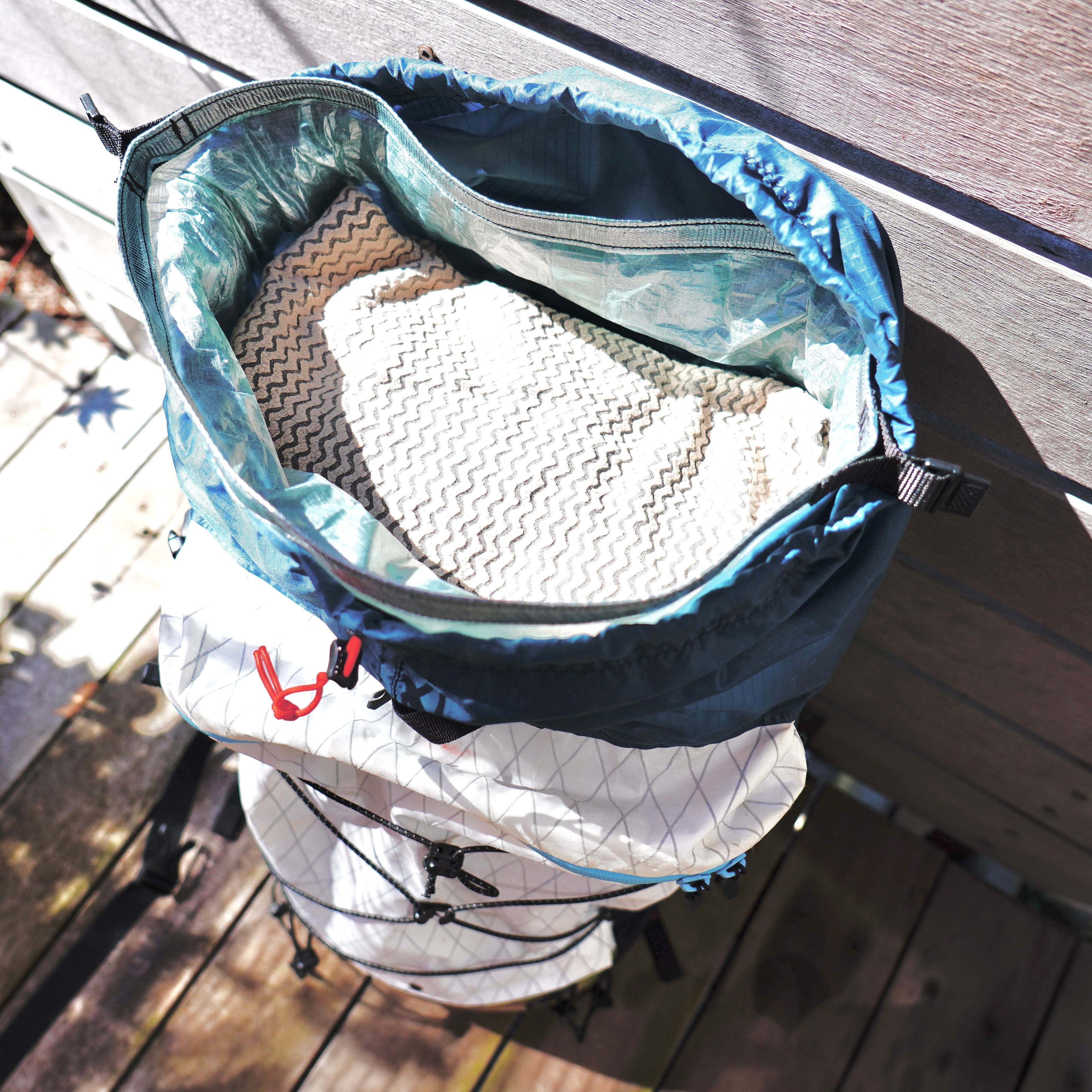 この商品は0.8ozダイニーマ生地 (DCF)を使用しております。貼り合わせ部分はボンディング加工しており、底の部分の縫い目はシーム加工していますので防水性が高くなっています。防水性が無いバックパックのインナー防水ケースや濡れたテントや衣類を入れるドライバックとしてもおすすめです。